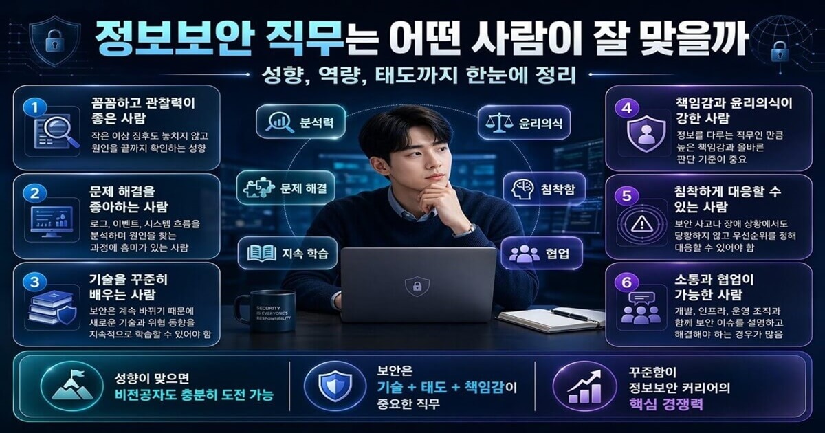 즉 정보보안 직무는 단순히 기술을 외우는 사람보다, 문제가 생겼을 때 겉만 보고 지나치지 않고 끝까지 원인을 확인하려는 사람에게 더 잘 맞습니다.