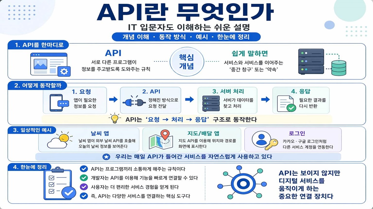 IT를 처음 배우는 사람이라면 API라는 단어가 얼마나 낯설게 느껴지는지 잘 압니다. 하지만 웹 서비스가 돌아가는 구조를 이해하고 나면, API는 더 이상 어려운 개념이 아닙니다. 오히려 없어서는 안 될 핵심 연결 장치라는 걸 바로 체감하게 됩니다.