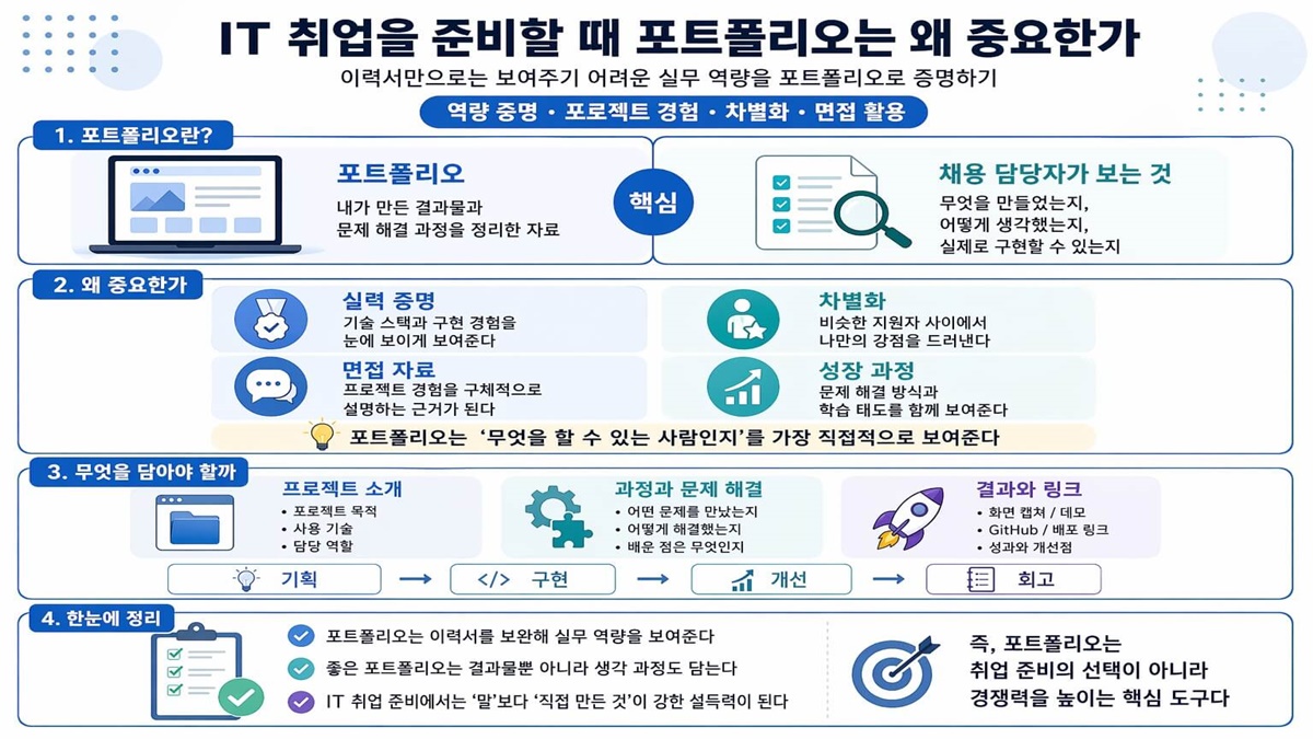 일반적으로 IT 취업 준비는 자격증과 강의 수강 이력으로 충분할 것이라고 생각하는 분들도 있는데, 실제로 써보니 그건 출발점일 뿐이었습니다. 기업이 이력서에서 확인할 수 있는 건 "무엇을 배웠다"는 사실까지입니다. 그 기술을 실제 상황에서 어떻게 적용했는지는 포트폴리오가 아니면 보여줄 방법이 없습니다.
